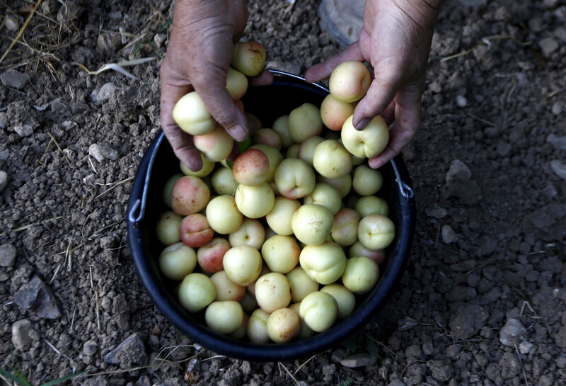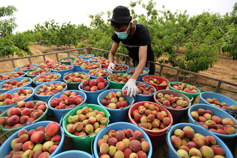A Palestinian farmer harvests peaches in Khan Younis, southern Gaza Strip, on 1 June.