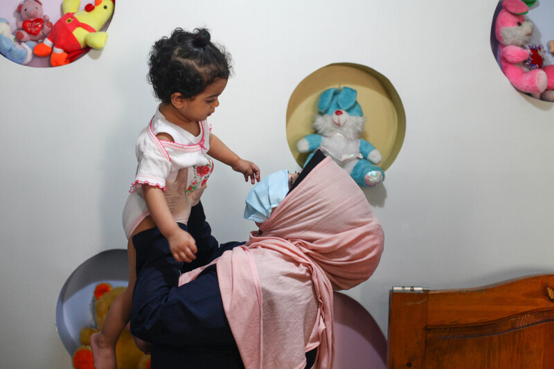A Palestinian preschool teacher plays with a child at a kindergarten newly opened following a nearly three-month closure as part of measures to prevent the spread of COVID-19, Gaza City, 2 June.