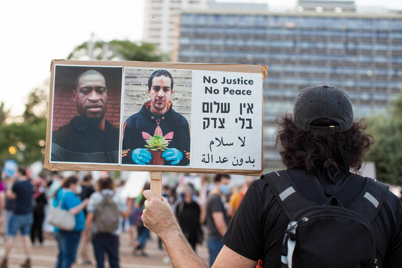 A protester holds a sign depicting George Floyd, a Black American killed by a police officer, and Iyad Hallaq, a Palestinian man with autistic traits killed by Israeli police, during a demonstration against Netanyahu’s plan to annex parts of the West Bank, held in Rabin square, Tel Aviv, 6 June.