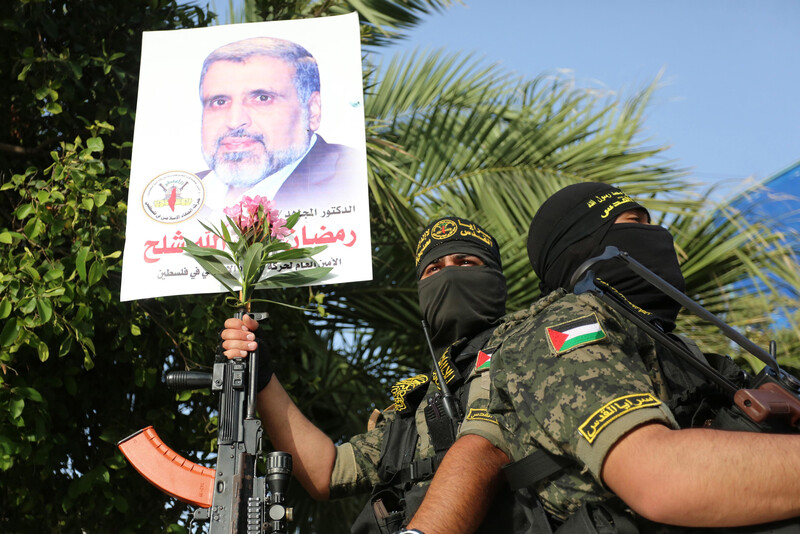 Palestinian fighters from the armed wing of Islamic Jihad take part in a symbolic funeral for Ramadan Shallah, the resistance party’s former leader, Gaza City, 7 June. Shallah died in Beirut the previous day following a prolonged illness.