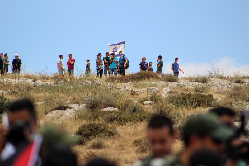 Israeli settlers watch from a hilltop as Palestinians argue with occupation forces during a protest against annexation in the village of Susiya, south of the West Bank city of Hebron, on 19 June.