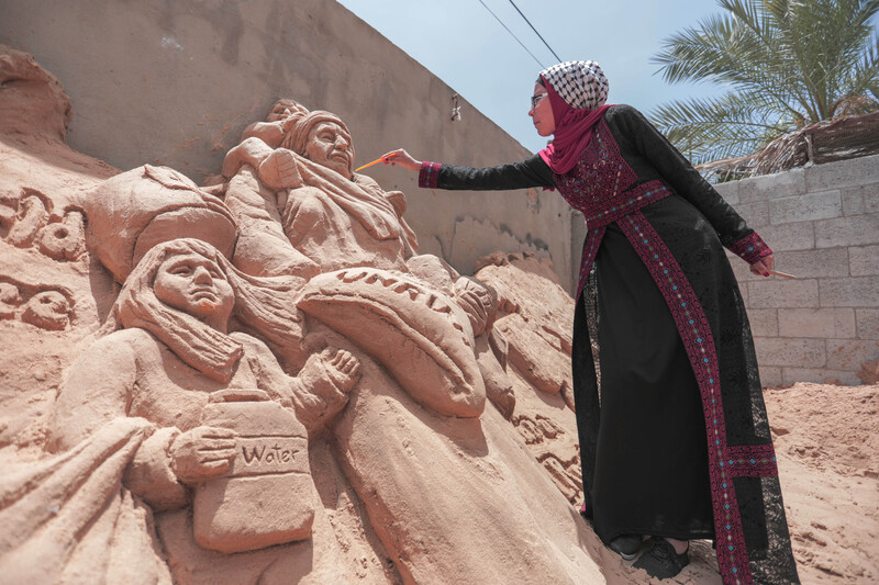 Palestinian sand sculptor Rana Ramlawi finishes a new work on the occasion of World Refugee Day, Gaza City, 20 June. Some five million Palestinians are refugees registered with the UN agency UNRWA, and two-thirds of Gaza’s population of two million are refugees.