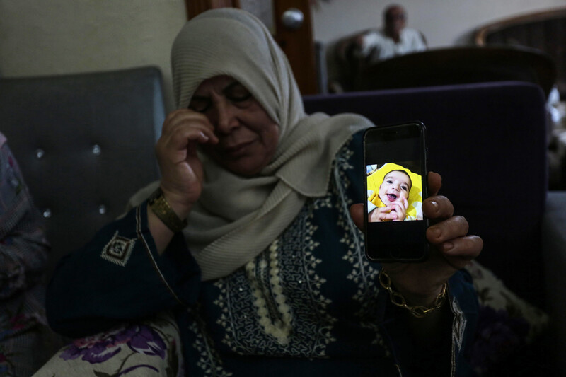 The grandmother of Omar Yaghi displays a photo of the infant on 23 June, several days after the 9-month-old died from heart failure while his family waited for an Israeli permit for travel outside Gaza for life-saving medical treatment for the child.