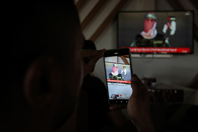 Palestinians in Khan Younis, southern Gaza Strip, watch Abu Obeida, spokesperson for the armed wing of Hamas, deliver a speech in which he warned that Israel’s extension of sovereignty to parts of the West Bank would be considered a “declaration of war,” 25 June.