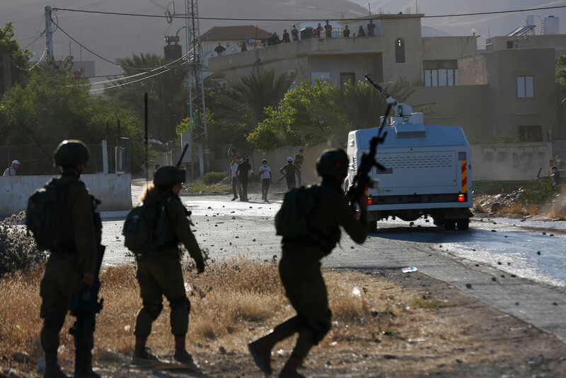 Palestinians confront Israeli occupation forces during a protest against annexation, Jordan Valley, 24 June.