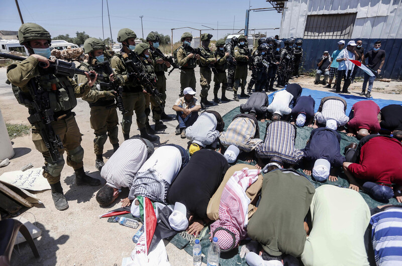 Israeli occupation forces stand by as Palestinians perform Friday prayers during a protest against annexation in the village of Haris, near the West Bank city of Nablus, 26 June.
