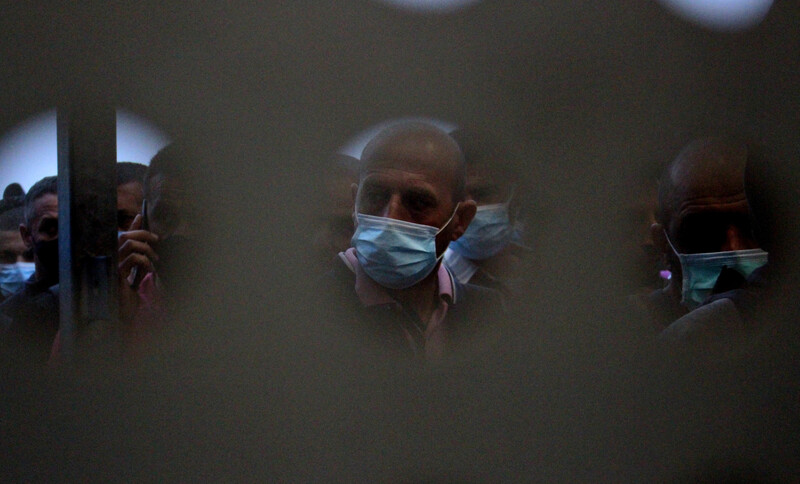 Palestinian laborers queue to enter Israel via the Mitar checkpoint in the West Bank city of Hebron on 28 June. Palestinians who work in Israel are believed to be a primary vector for the spread of COVID-19 in the West Bank.