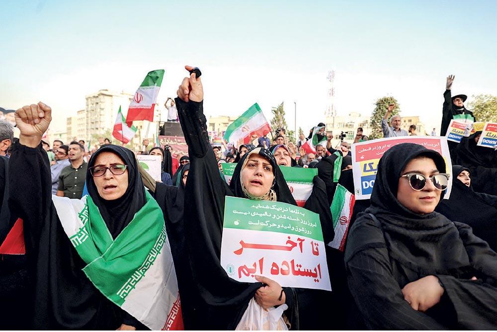 Iranians chant slogans and wave national flags at Enghlab Square in the capital Tehran on June 24 as they celebrate a ceasefire between Iran and Israel. AFP