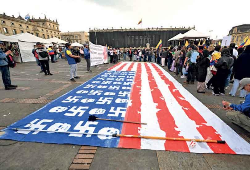 A giant banner representing a US flag with swastikas is pictured during the ‘March for Sovereignty and Democracy’ against US President Donald Trump’s threats to Colombia’s President Gustavo Petro at Bolivar Square in Bogota on January 7, 2026.